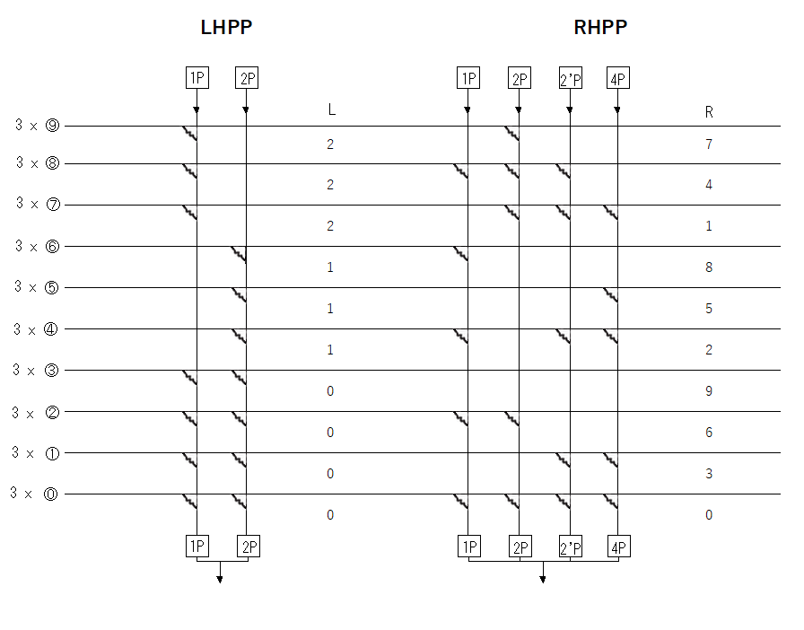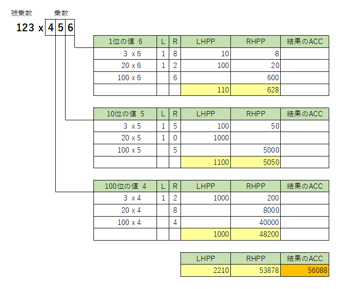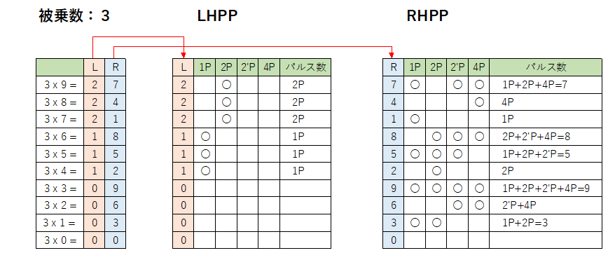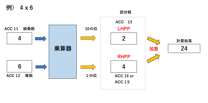 | 乗算は、九九表を使い積を10位桁と1位桁に分け、10位(LHPP)と1位(RHPP)の部分積を集計して積を計算します。 |