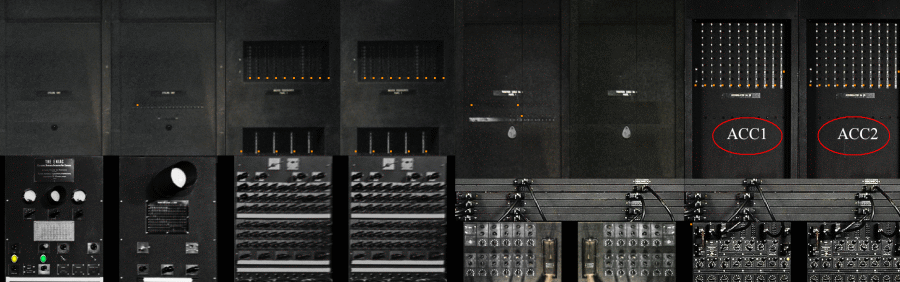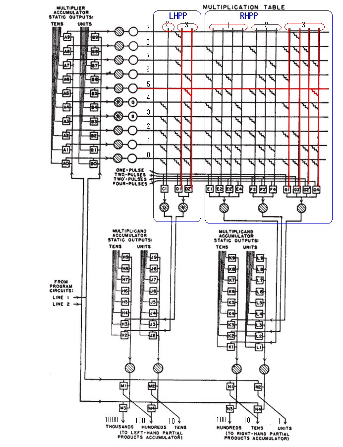 | ●乗算処理の概要 @被乗数をACC11、乗数をACC12へ A乗算器は 10の位をACC13、1の位をACC14 or ACC15へ B各々の部分積(LHPPとRHPP)を求める C部分積は、シフター(桁処理)をおこない、L側・右側を加算する D左側と右側の合計が乗算積(20桁) 10の位: LHPP(Left Hand Partial Product) 1の位: RHPP(Right Hand Partial Product) |