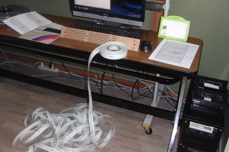 キーパンチャーは、紙テープが読めるので、間違い部分を全部穴を開けたり、紙テープの切り貼りをします。