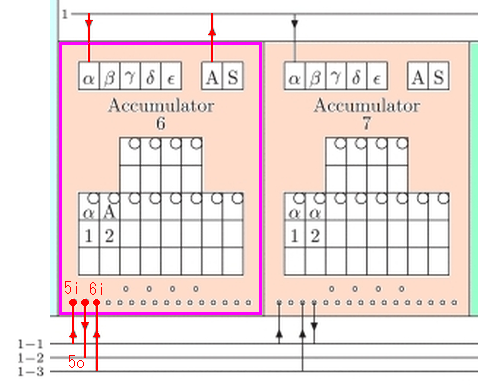 ●プログラムの制御フロー @プログラムライン1-1の開始ユニット出力信号は、アキュムレータ6と7のプログラム5と、定数送信器のプログラム26を起動します。 この結果、2つのアキュムレータのそれぞれに1が加算されます。 ![]() Aプログラム 5 が完了すると、アキュムレータ 6 はプログラム ライン 1-2 に接続された 5o ラインに制御パルスを送信し、 マスター プログラマのステッパー C の入力に送られます。 ![]() Bステッパー C のカウントが 999 を超えていない場合、 マスター プログラマはプログラム ライン 1-3 に接続された C1o ラインに制御パルスを送信します。 ![]() Cプログラムライン1-3の信号は、両方のアキュムレータのプログラム6をトリガーします。 このプログラムは、アキュムレータ6にデータを2回送信させ、アキュムレータ7にデータを2回受信させ、現在の値に加算します。 つまり、アキュムレータ6の値が2倍になった値がアキュムレータ7に加算されることになります。 ![]() Dこの加算が完了すると、アキュムレータ 7 は 6o 端子に制御パルスを送信し、 プログラム ライン 1-1 を駆動して、プロセス全体を再度開始します。 ![]() |