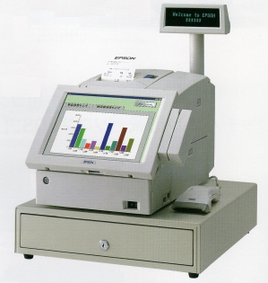 バーコードリーダー、キャッシュドロア、レシートプリンター付。 オプションのカスタマディスプレイ無し。