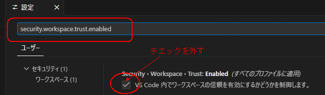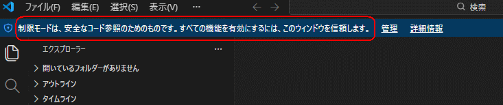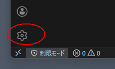 VSCodeの「制限モード(Workspace Trust)」を解除する。 ![]() @画面左下の歯車マーク「設定」をクリック ![]() A検索バーに「security.workspace.trust.enabled」と入力し、チェックを外して再起動 ![]() |